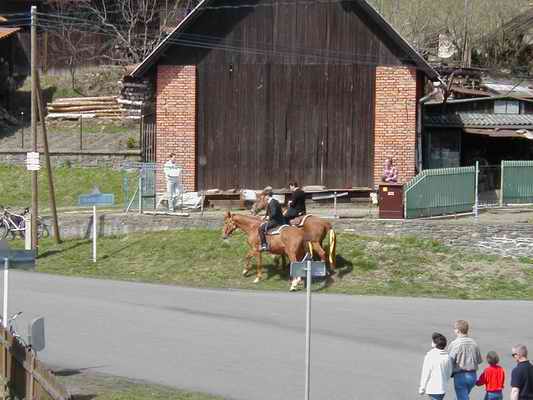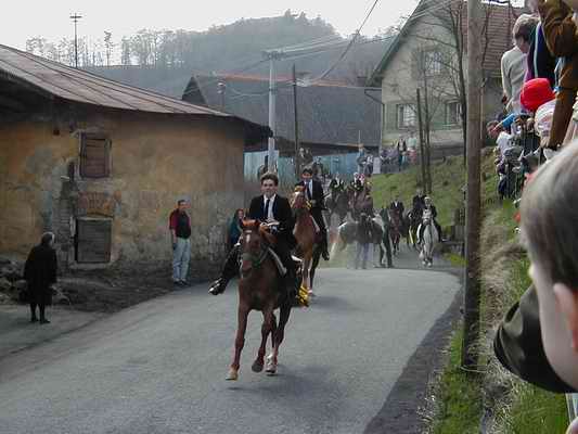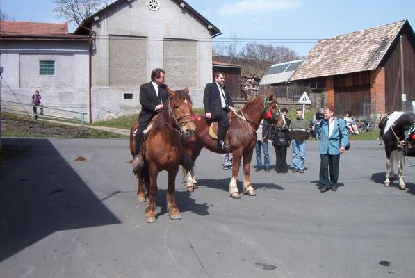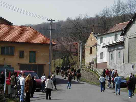 Další a také starší a oblíbenější zvyk v naší obci je tzv. rajtování nebo také tzv. jízda okolo osení. Je to starodávný křesťanský zvyk, jehož původ sahá až do středověku. Ve Fulnecké kronice je o této události zmínka uvedená asi těmito slovy: "Po bitvě na Bílé hoře přepadávaly hordy rozpadlých vojsk města. Také naše město bylo přepadeno, ale za pomoci sedláků na koních, kteří se sjeli na velikonoční jízdu, se podařilo útok odrazit." "Rajtování" začíná v neděli před Velikonočním pondělím pravidelně ve 13:00 hodin u kostela. Jede se přes pole nad vesnicí a pak se objíždí horní konec obce. Dále přes louky do osady Nové Dvory. Zpívá se píseň asi z 15. století "Vstal z mrtvých". Po příjezdu do Lukavce z Kněžího pole se zpívá a hraje píseň "Aleluja, zdráv buď náš milý Spasiteli". Muzikanti zahrají jednu sloku písně a pak je svým zpěvem vystřídají jezdci na koních. Vpředu před muzikanty a jezdci jede tzv. "Křížový otec"- Kreuzvater, který veze kříž od domu k domu a lidé jej uctívají políbením. Takto se objede celá obec. Kde je u statku velký dvůr a otevřou se vrata, udělají jezdci kolo ve dvoře. Jízda končí u pomníku padlých pod kostelem a za vyzvánění zvonů. Zde muzikanti zahrají tři sloky písně "Bože chválíme Tebe" a pak jezdci jednotlivě uctívají kříž a odjíždějí. Celá slavnost pak končí v místním kostele sv. Jana Křtitele svátostným požehnáním a průvodem jezdců a věřících okolo kostela. Zvěst Zmrtvýchvstalého Krista se takto roznáší do polí a po vesnici již několik staletí. Dnes již sice není v obci 70 koní jako dříve, takže se koně dovážejí z okolí a již také "nerajtuje" tolik jezdců co kdysi za časů našich dědečků. V Lukavci se jezdilo i v době vlády ateismu a socialismu a i přes nátlak tehdy mocných, aby se od jízdy upustilo, se jezdilo a jezdit se bude dále. Jízdu nepřerušilo ani nevlídné počasí - v roce 2012 nečekaně kolem 13:00 začal padat sníh, v roce 2013 napadlo asi 30 cm sněhu a celý průběh jízdy byl větrem a sněhem doprovázen. Přesto vyjelo 9 koní v čele s novým "Kreuzfotrem" objelo vesnici zkrácenou trasou. I tomuto netradičnímu zážitku přihlíželo několik desítek diváků, které počasí neodradilo. Tato tradice je udržována v naší vlasti jen v Lukavci. Podobnou tradici udržují již jen v Německu Lužičtí Srbové. Jako naši předkové si tímto způsobem vyprošovali požehnání pro svá pole a pro celou obec od zmrtvýchvstalého Krista, tak i my se snažíme zachovávat dědictví a zvyky našich otců. V roce 2013 organizátor a duše tohoto zvyku pan Václav David jel letos již po 44., což je asi mezi jezdci, kteří kdy jeli, rekord! V roce 2013 byla úloha hlavního jezdce předána do rukou mladšího nástupce Jana Davida. (Zdroj: Lukavecký list č. 02/99, vlastní zpracování) |